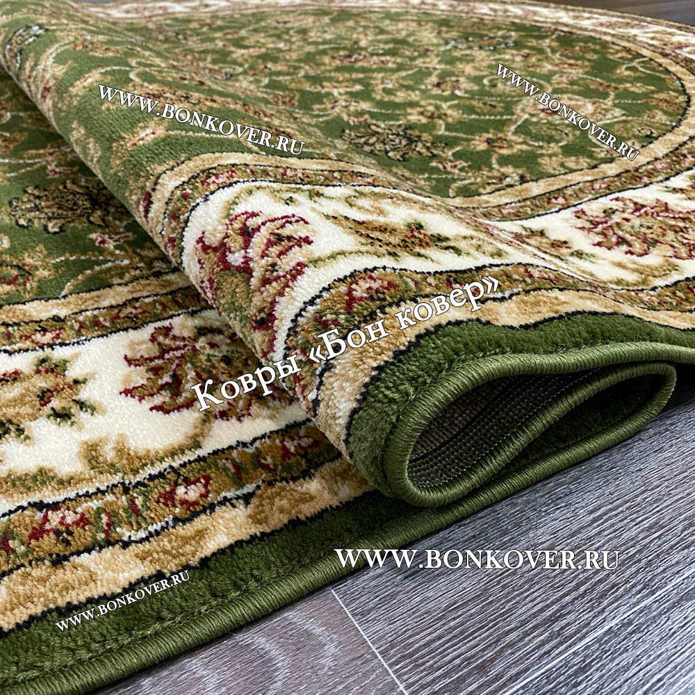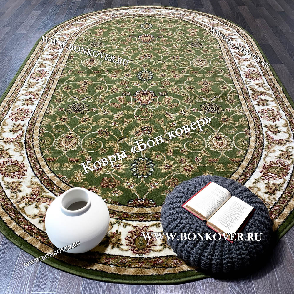 Изящный РОССИЙСКИЙ ЖАККАРДОВЫЙ КОВЕР ЗЕЛЕНЫЙ ОВАЛЬНЫЙ наполняет интерьер помещения теплом и уютом, гармонично сочетает в себе изящество и красоту. Он соткан из высококачественного сырья, прочный и долговечный.