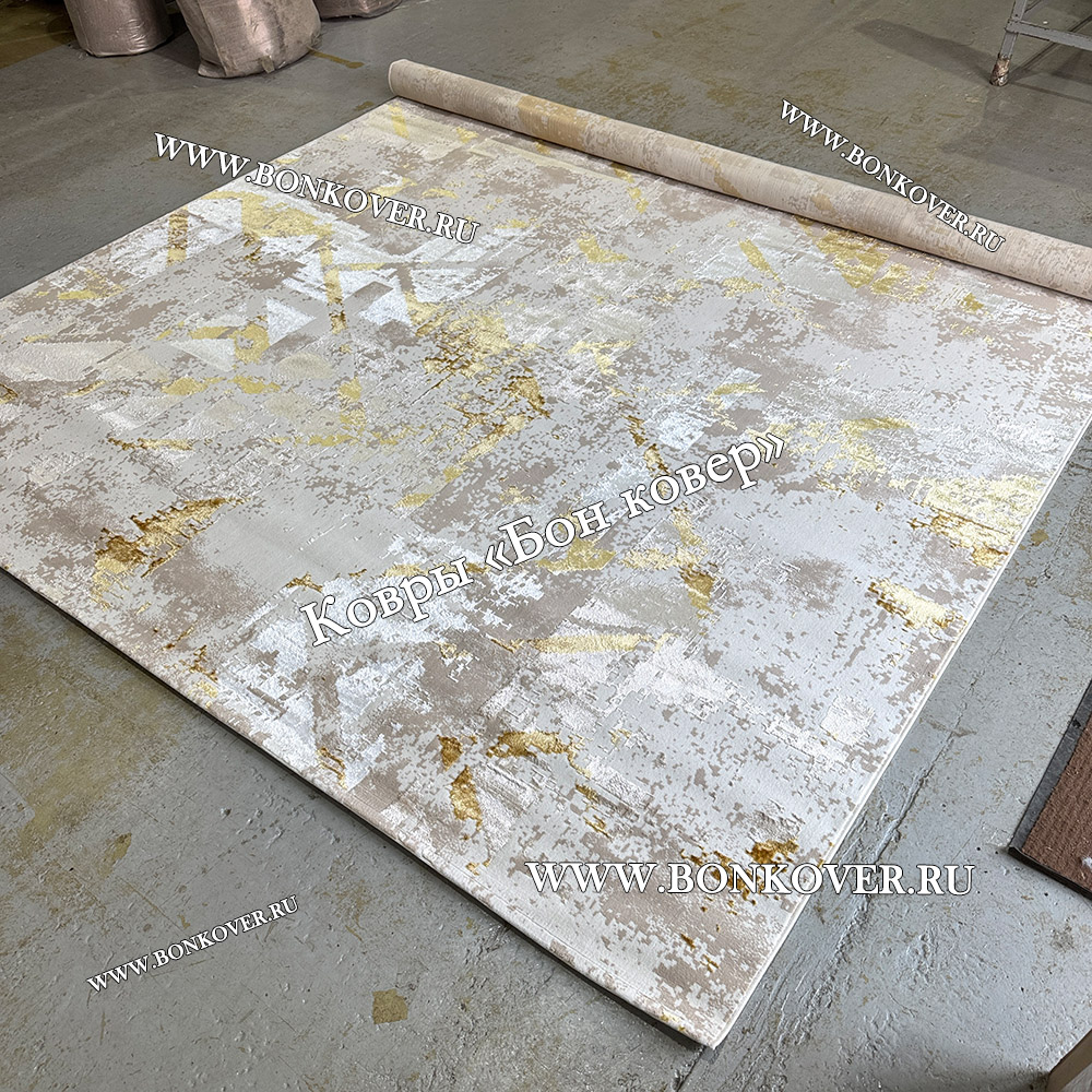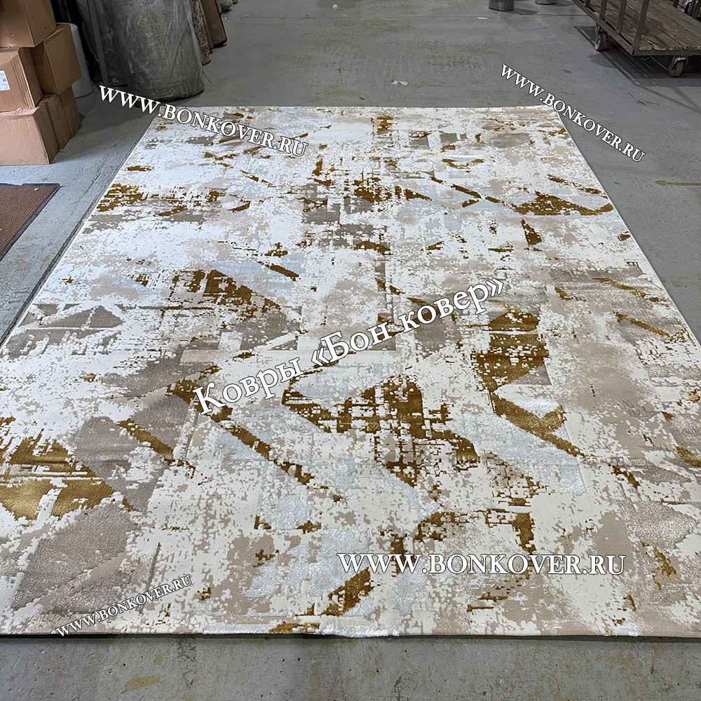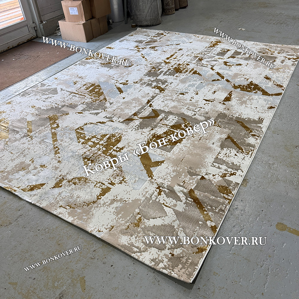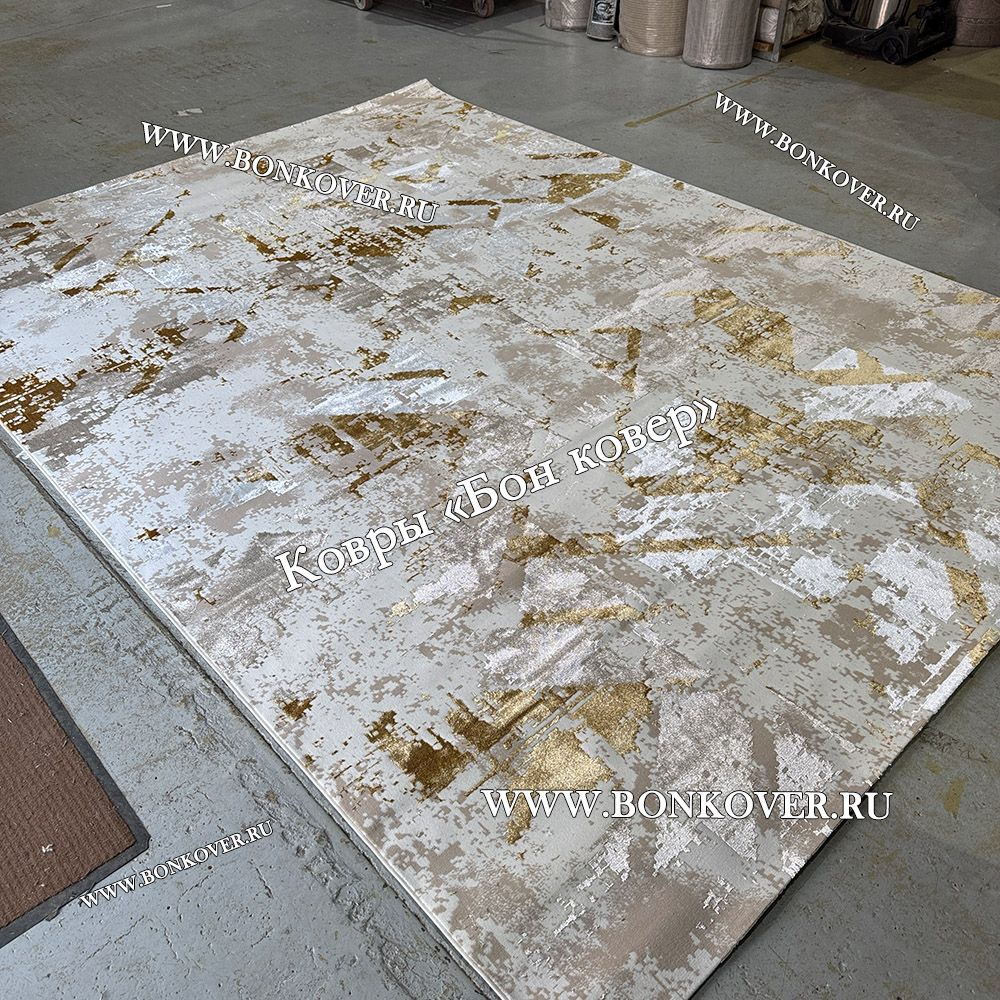 Элегантный Турецкий Прямоугольный Ковер Бежевый с Золотистым дизайн 01 наполняет интерьер помещения теплом и уютом, гармонично сочетает в себе изящество и стиль. Он создан из износостойких материалов, прочный и долговечный.